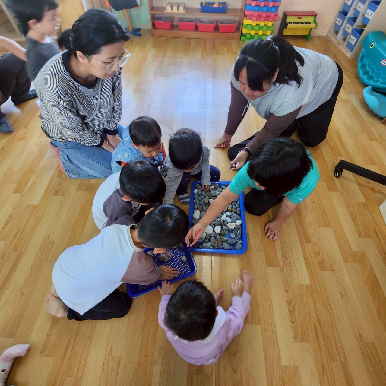 在「寶石尋找遊戲」中,老師事先將東海岸玉石藏在親子館各個角落,孩子們立刻展開搜尋行動。有的蹲下來仔細觀察玩具櫃,有的在桌角與遊戲區翻找,當找到玉石時,孩子們臉上露出開心又有成就感的笑容,現場氣氛熱鬧又充滿歡笑。