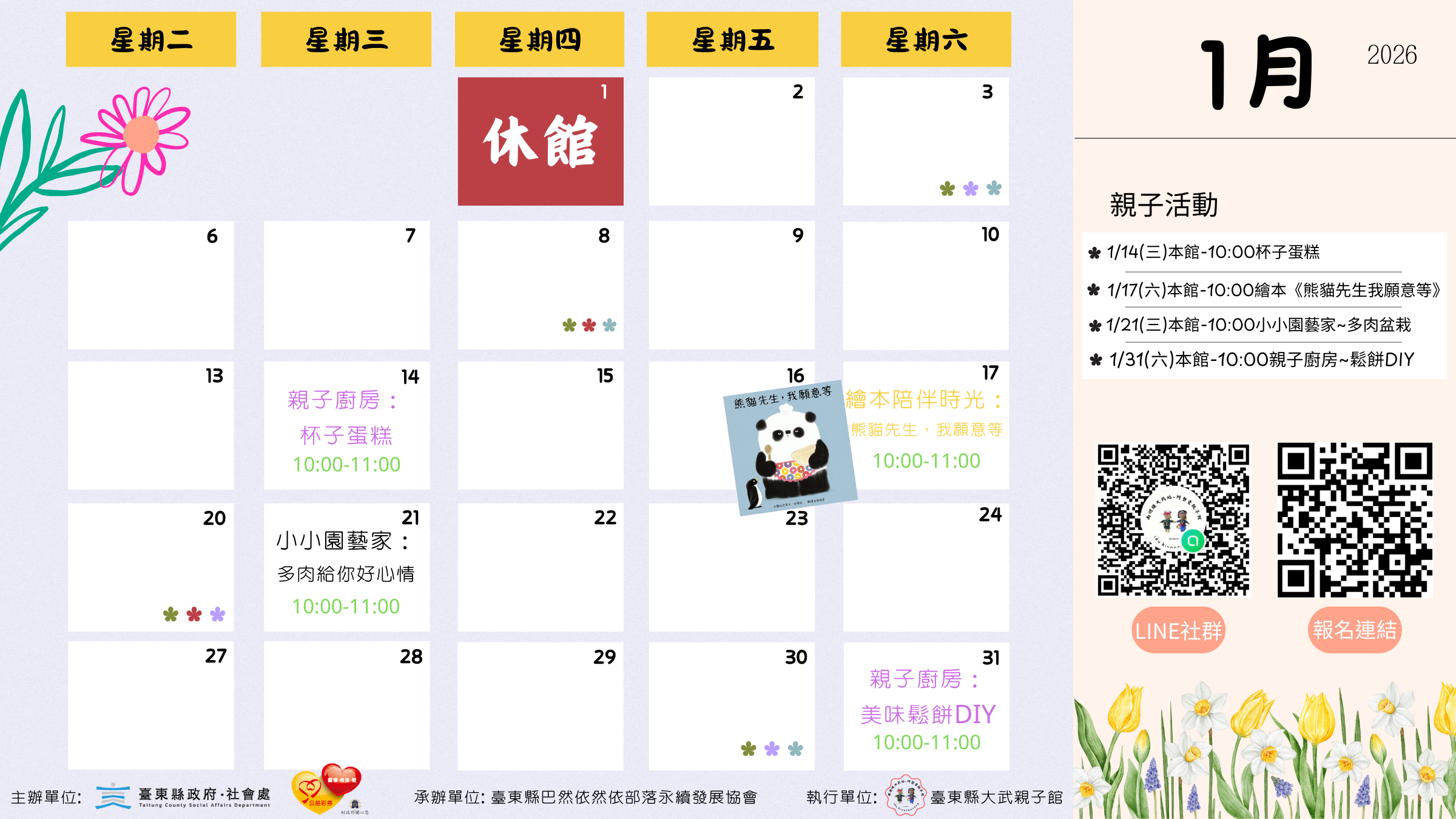 ~臺東縣大武親子館~ 115年1月活動行事曆 1.1/7(三)10:00-11:00 地點:本館親子活動:親子廚房~小小蛋糕,大大幸福