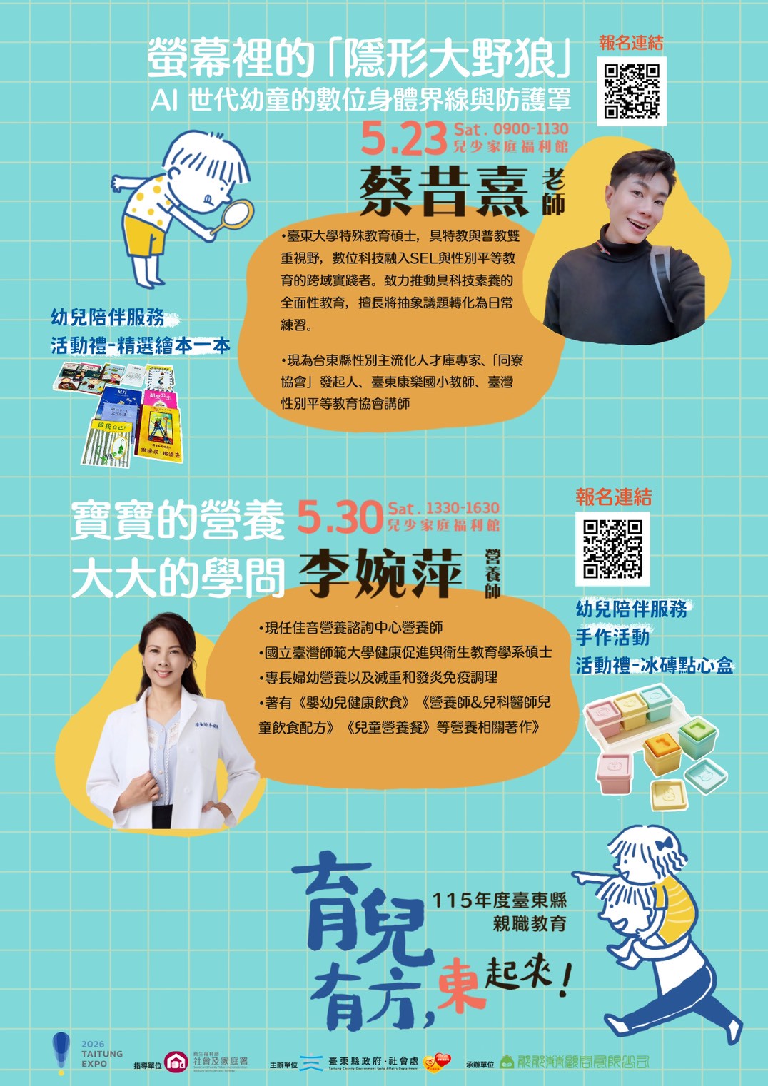 進入數位時代,是否也擔心孩子在螢幕前迷失?或者還在為了副食品該怎麼吃而煩惱?別擔心!5月份「育兒有方,東起來」為您請到最強講師陣容,要幫大家破除教養迷思、掌握健康秘訣💪